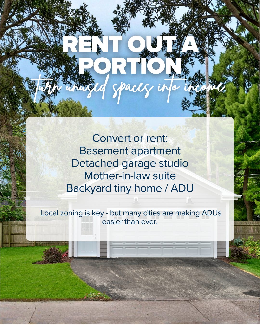 You could buy a home with an existing ADU (detached cottage, basement unit, garage studio). Or buy an “ADU-ready”: daylight basement + exterior door, or garage with alley access. Start by renting a room or partial suite now, then add/finish an ADU later when cash allows.